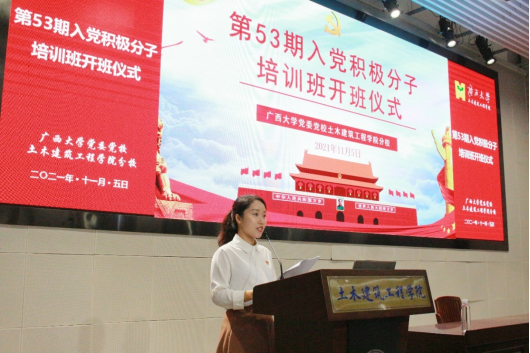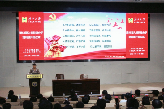 11月5日下午,万象城awcsport官网党委党校万象城awcsport官网分校第53期入党积极分子培训班开班仪式在新结构实验平台综合楼报告厅举行。学院党委书记戴永恒、党委副书记秦建丽出席开班仪式。开班仪式由潘桂祯老师主持,第53期入党积极分子培训班全体学员与会。