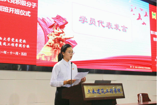 随后,培训班学员、2021级本科生张钰研作为学员代表发言。她认为,站在两个一百年的历史交汇点上,我们作为时代新人要继承和发扬伟大建党精神,坚定理想信念,以切实的行动提高自身素养,在实现中华民族伟大复兴的中国梦新长征路上奋勇搏击。她向全体学员倡议:时刻以一个优秀共产党员的标准来要求和鞭策自己,不断完善自己,发挥党员先锋模范带头作用,在实践中与党同心、与人民同行,将青春融入祖国山河之中。