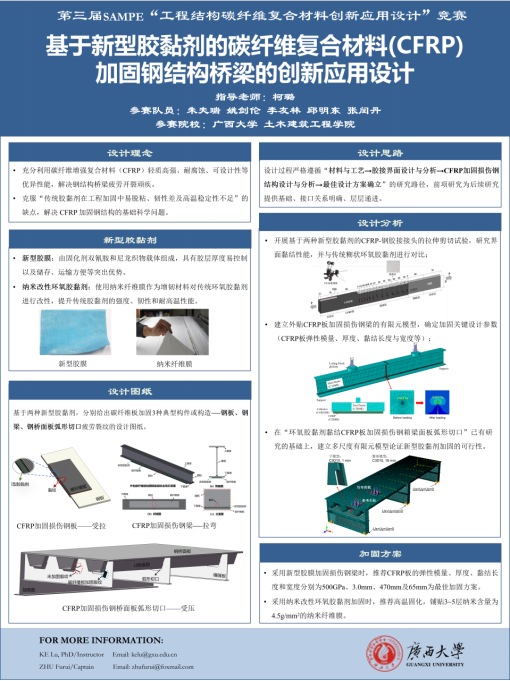 SAMPE“工程结构碳纤维复合材料创新应用设计”学生竞赛鼓励参赛者充分发挥碳纤维复合材料的轻质高强、耐腐蚀、可设计等性能,提出该材料在工程结构中的创新性应用,并给出可靠的设计分析与说明。竞赛为国内外高校土木工程、交通工程、海洋工程、复合材料、力学等专业参赛者提供了一个公平公正、施展才华、拓宽视野的国际化舞台。