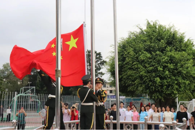 清晨7时40分,西校园田径场早已旌旗飘扬,人声汇聚。学院500余名学子身着整齐服装,在升旗台正面列队肃立,静候升国旗仪式开始。护旗手迈着铿锵有力的步伐护送国旗入场,随着雄壮的《义勇军进行曲》奏响,全场目光聚焦于冉冉升起的五星红旗,同学们齐声奏唱国歌,歌声回荡在田径场上空,每一个音符都凝聚着对祖国母亲的深情致敬与无限祝福。朝阳下,红旗与青春的脸庞相映,定格成校园里最动人的爱国图景。