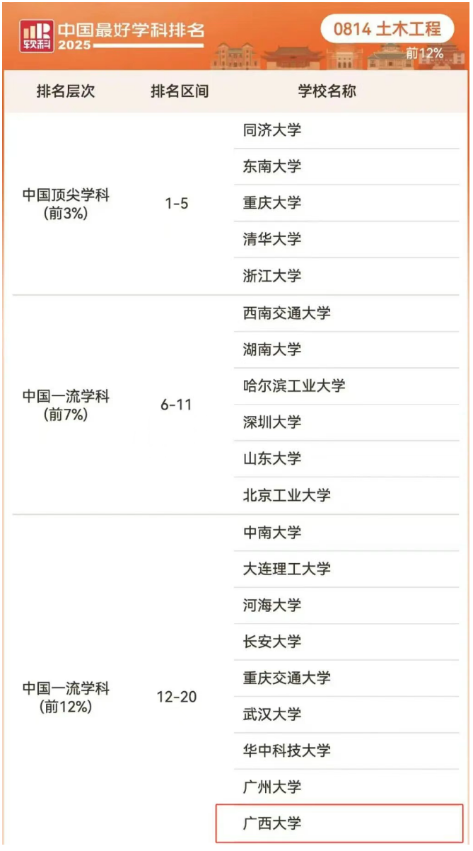 2022-2025年万象城awcsport官网土木工程学科软科排名。