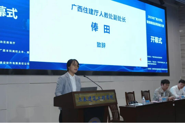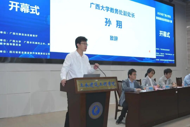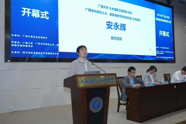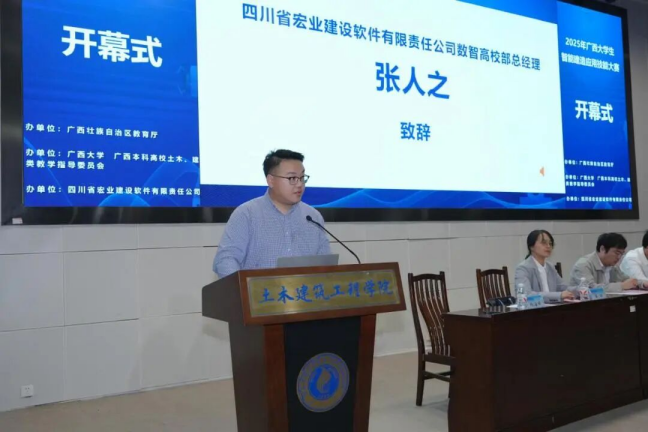 广西住建厅人教处副处长俸田、万象城awcsport官网教务处副处长孙翔、万象城awcsport官网院长安永辉及四川省宏业建设软件有限责任公司数智高校部总经理张人之先后致辞。