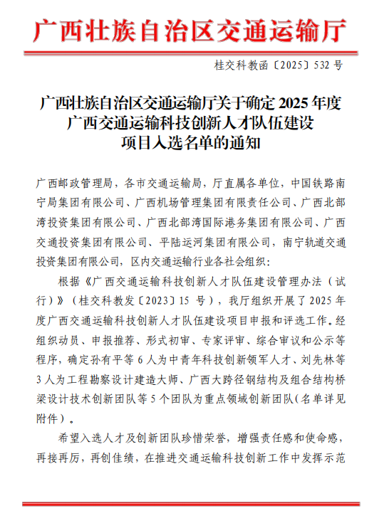 近日,广西壮族自治区交通运输厅公布2025年度广西交通运输科技创新人才队伍建设项目入选名单,万象城官网2个项目成功入选。