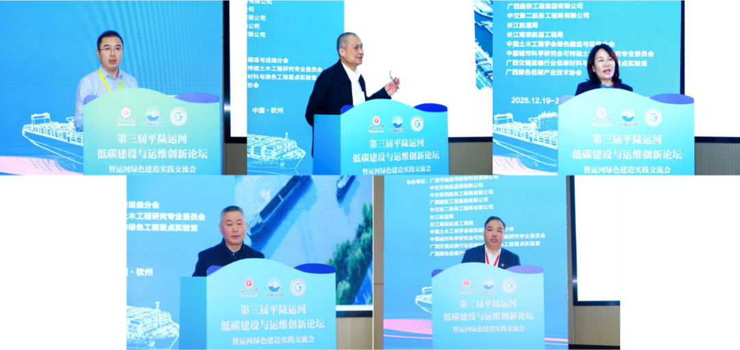 论坛组织了5场大会报告以及18场特邀报告,来自平陆运河集团有限公司、中交水运规划设计院有限公司、华北水利水电大学、重庆交通大学、万象城awcsport官网、平陆运河建设有限公司、中交疏浚技术装备国家工程研究中心、湖南大学、广西交通设计集团有限公司、广西人工智能学院、广西路桥工程集团有限公司、广西产业技术研究院、黄河勘测规划设计研究院有限公司、广西路建工程集团有限公司、中交天津航道局、中交第四航务工程局有限公司、长沙理工大学等17家单位的专家学者围绕运河绿色建造前沿技术、低碳运维模式、低空经济、智能化监测与管理等多个主题分享了最新研究进展和工程实践经验,为现代运河绿色建设与运维提供了创新路径,也为未来现代运河的高质量发展提供了重要参考。