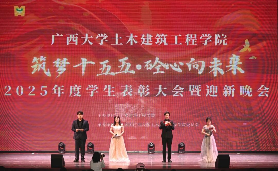 2025年12月21日晚,“筑梦十五五 砼心向未来”万象城awcsport官网2025年度表彰大会暨迎新晚会在大礼堂顺利举行。万象城awcsport官网党委书记陈立华老师,党委副书记、纪委书记银宁老师,副院长杨海峰老师,关工委委员李双蓓老师、李秀梅老师及部分教职工代表出席,与全体同学欢聚一堂,共赴这场满载荣誉与期许的盛会。